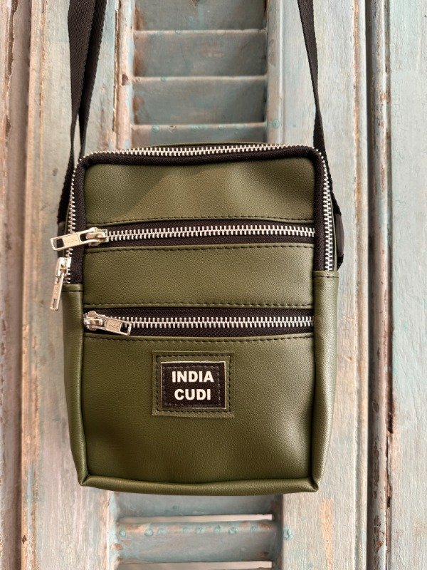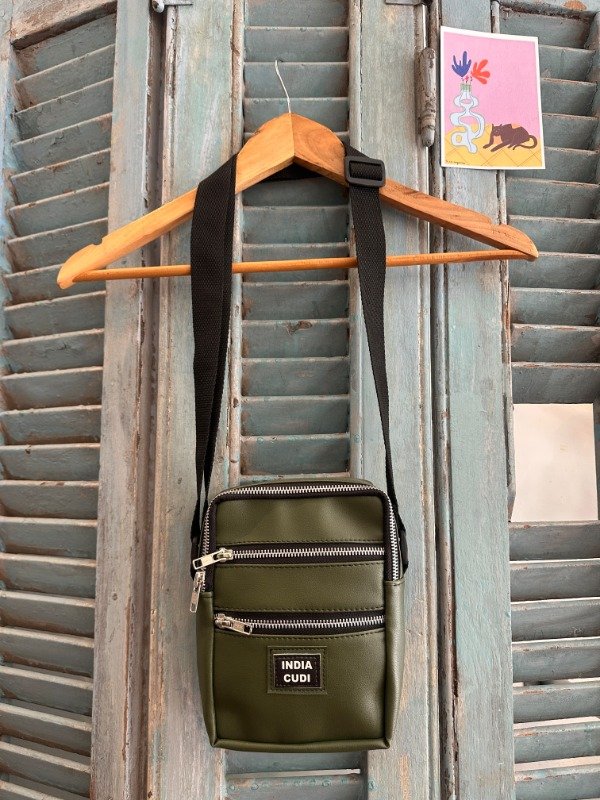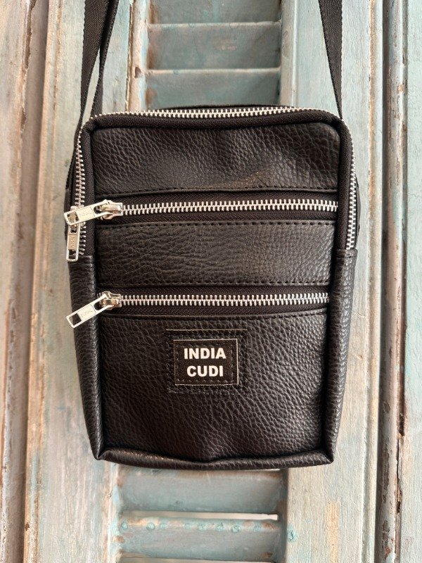 Morral de cuero ecológico con tira regulable. Tiene un cierre central y dos bolsillos externos. Está forrado en el interior.